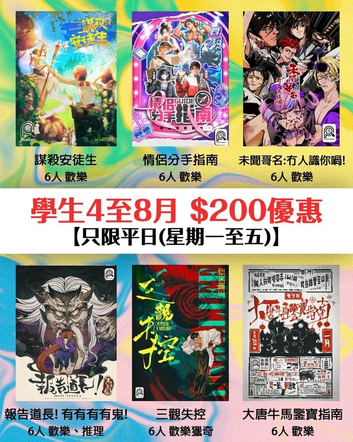 成功經由 PLAYLARP 客服預約 3 至 4 月期間(星期日下午、紅日下午除外)玩以上精選劇本,即可劃一以每位 $220 玩到!🥳